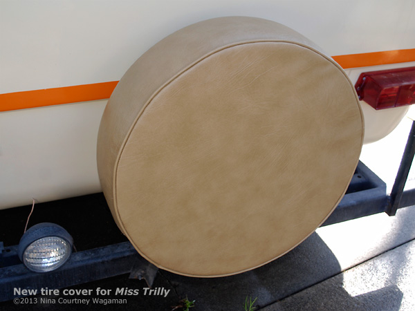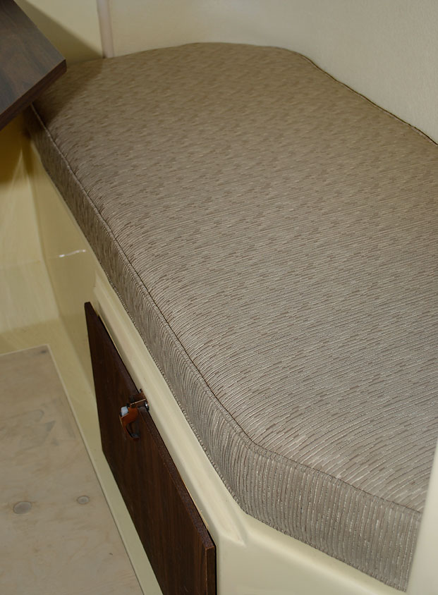 I spent a lot of time looking at choices for new floor covering for Miss Trilly–too much time. As part of the search, I sent for carpet tile samples from Flor.com. One of them was the perfect color–Porpoise–a soft taupe brown. We calculated how many 19.7″-square tiles we’d need to install. It was immediately obvious to us that we could not justify spending $300 for such a small area, no matter how nice it was. We continued to brainstorm for few more days. Nothing we researched seemed affordable, the right color, or the right look. As mentioned, we didn’t want to glue or tape anything down to the gelcoat and whatever we chose had to “work” with the design. Aesthetics are as important to us as function.