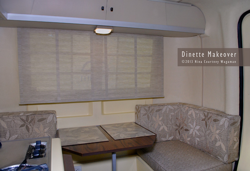 The front dinette is all put together in this photograph. At some point, perhaps, we will change the dark fake wood throughout to a lighter and more rugged material. I have already selected a plastic laminate that would work well with the new colors.