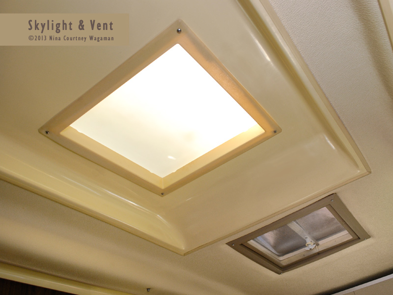 Roughly cut openings go through both the saddle and the AC indent in the roof. We found an old square-cornered vent “garnish” at a RV used parts store. The sides were extra tall and had to be cut down. The brittle, yellowed plastic (a nearly perfect match to the ceiling gelcoat, actually) cleaned up well. The flange dimension just barely covered the jagged opening in the ceiling where the AC came through. After cutting small half-circle vents in the sides of the trim to allow for expansion, we glued a piece of white plexiglass to top of the frame. We now had a skylight! Clark attached standoffs to hold up the center of the saddle’s fiberglass sheet as extra insurance for proper drainage, then we screwed the new skylight in place. It allows a very pleasant light into the interior.