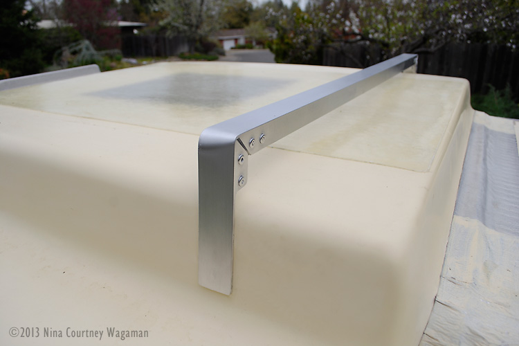 Clark built brackets for the 100-watt Grape Solar panel we bought at Costco. He used aluminum angle, cut and bent to fit the saddle. The corners are pop-riveted. The solar panel will be mounted with enough space beneath to clean and reach wiring.