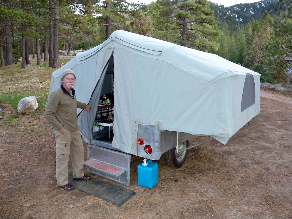 Mr Higgins attracts attention wherever he goes. He certainly doesn’t look like just another tent trailer. At sixty-five years of age, he is older than we are and still going strong. Higgins was designed and built for a different time, when things were built tough and made to last. Inevitably, as we fuel up our tow vehicle, someone will say, “What is this? I’ve never seen anything like it!” When we are camping and Higgins is set up, folks always come by to get a closer look. On a very crowded Thanksgiving Day weekend at Joshua Tree NP, the campgrounds overflowed with all manner of camping vehicles and tents. There were shiny Airstreams and VW Westies, a vintage “tin can” or two, a number of monstrous motorhomes and dozens of ultralight nylon backpacking tents. Joshua Tree is popular with the rock-climbing and bouldering crowd. One gal commented that, of all the RVs at the park, she liked Higgins best of all! So do we. Mr Higgins is a lovable old guy who loves to travel the back roads.